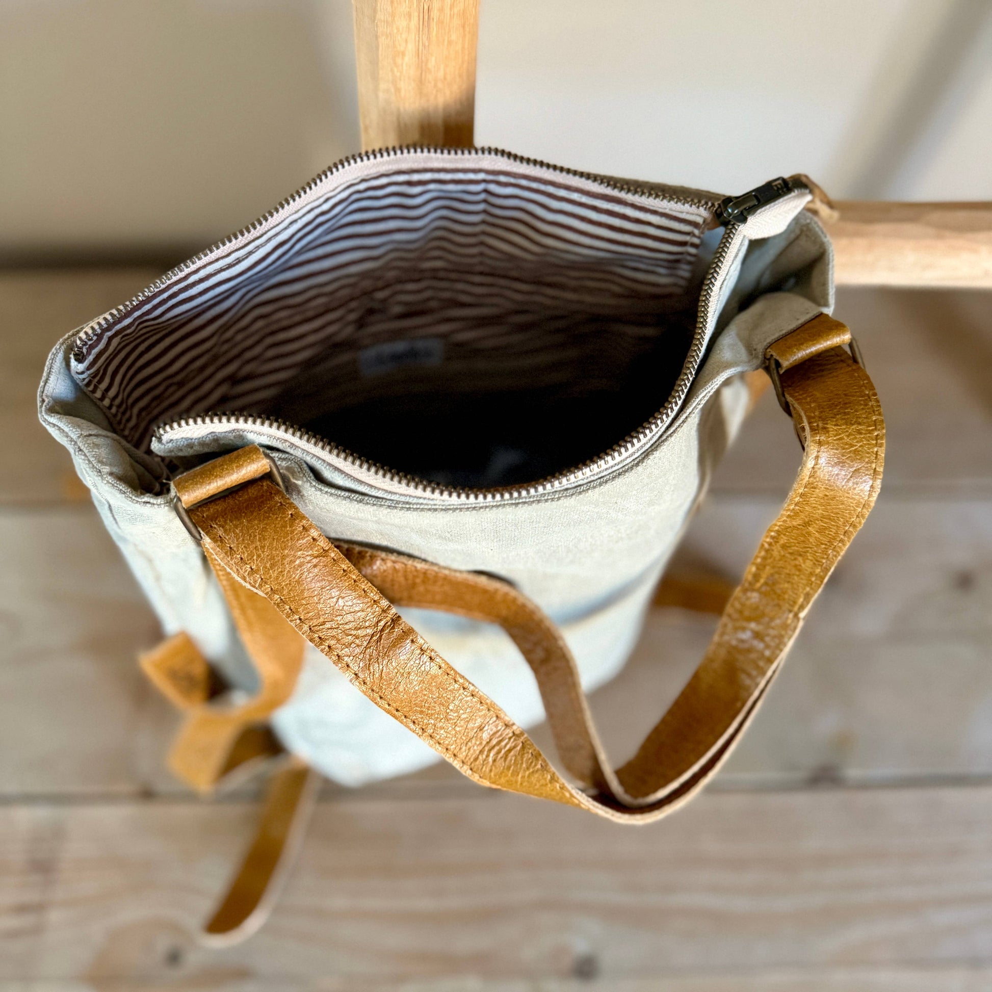 Der BackBag ist eine coole Tasche, die auf zwei Arten getragen werden kann. Die Tasche trägt sich angenehm leicht über der Schulter oder auf dem Rücken. Der coole Look der Tasche wird auch durch das reine Material, mit dem wir arbeiten, recyceltes Canvas, ein robuster Stoff in einem schönen Naturton, geschaffen. Die Tasche ist mit verstellbaren Lederschulterriemen ausgestattet. Das Innere ist vollständig mit gestreiftem Baumwollstoff gefüttert, mit einer Innentasche mit Reißverschluss und einem verstärkten Laptop-Fach (maximal 14 Zoll Laptop passt hinein) und schließt mit einem groben Reißverschluss. Die Maße sind 35 cm hoch, 32 cm breit und der Boden ist 14 cm. Der Stern auf der Vorderseite wird von Hand mit einer umweltfreundlichen Farbe bemalt. Die Farben können durch die Verwendung von recycelten und gebrauchten Stoffen variieren, außerdem kann hier und da ein Flicken auf den Stoff genäht sein, um Beschädigungen/Flecken abzudecken. Diese Tasche wird in einem kleinen Atelier mit Null-Abfall-Ziel produziert