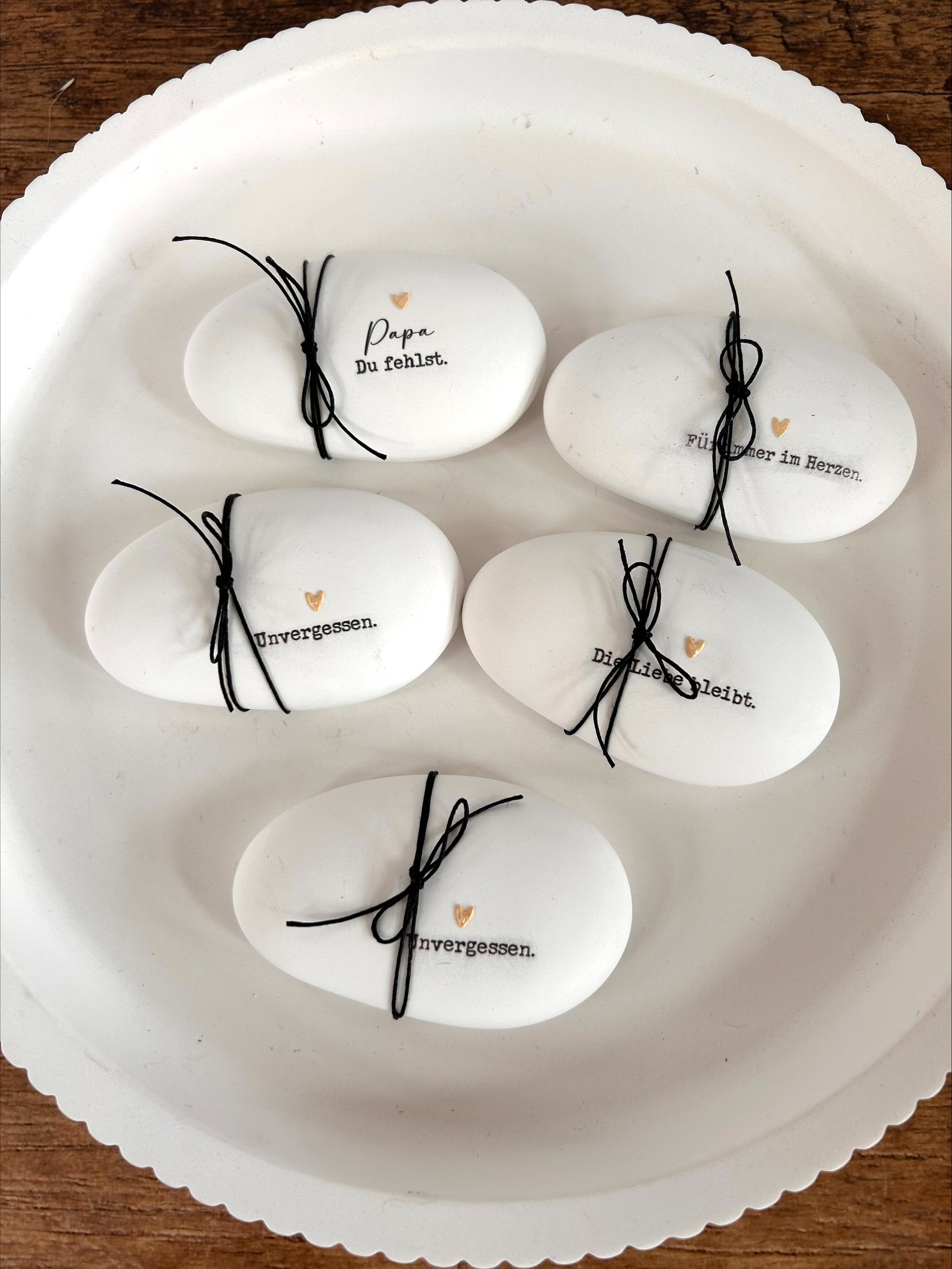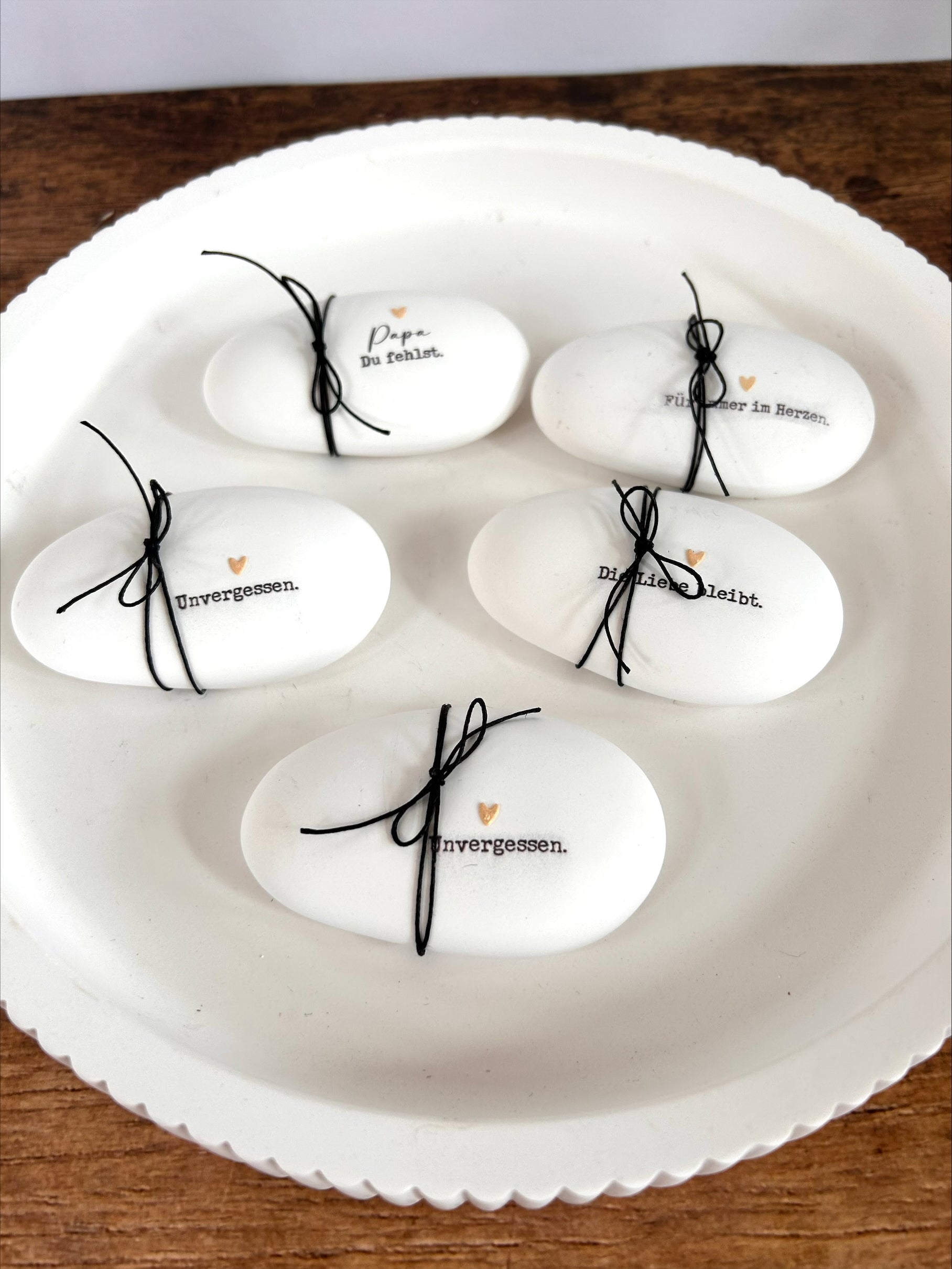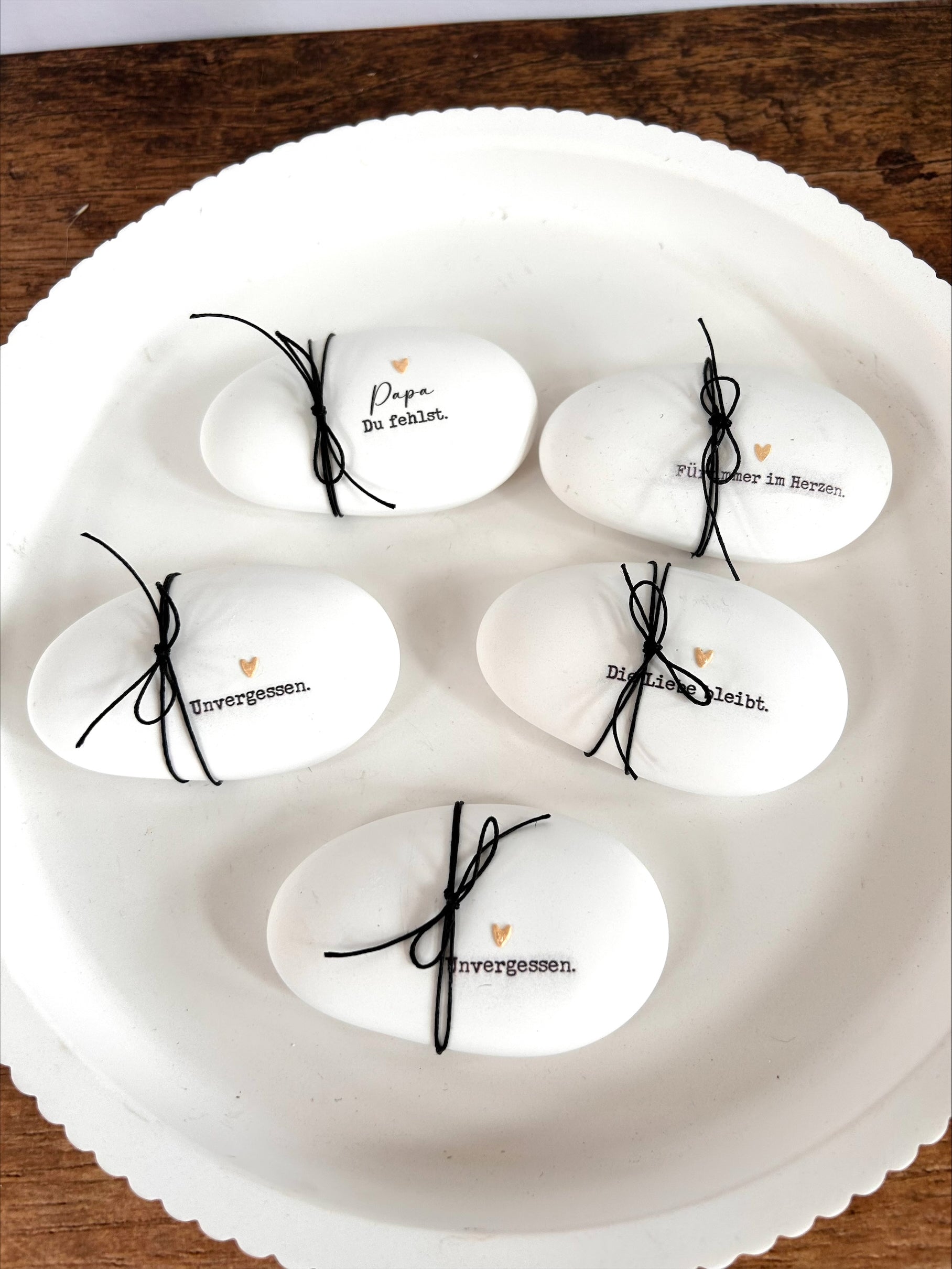 Jeder Stein ist individuell gestaltet und kann auf Wunsch personalisiert werden – mit einem Namen, einem Datum oder einer kurzen Botschaft. So entsteht ein einzigartiges Erinnerungsstück, das Halt schenkt und die Erinnerung bewahrt.